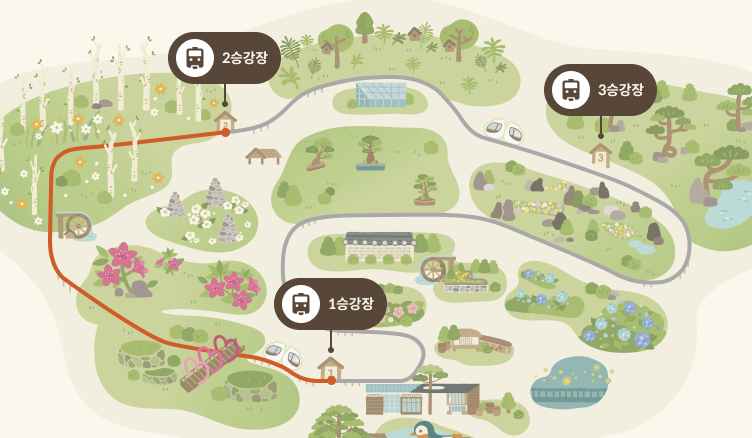 모노레일은 노약자의 편리하고 안전한 관람을 위해 화담숲 서쪽 이끼워 입구-화담숲 정상-분재원 사이를 지나는 1,213m순환선으로 전체 운행 소요시간은 약 20분 정도 됩니다. 1승강장, 2승강장, 3승강장으로 되어 있으며, 구간별로 금액이 다릅니다.