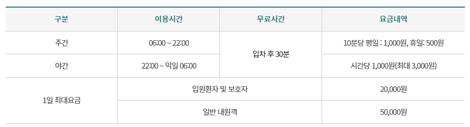 병원 내원객이 공영 주차장을 이용한 경우 주차료는 본인이 부담해야 하오니 병원 내 주차장을 이용해 주시기 바랍니다.