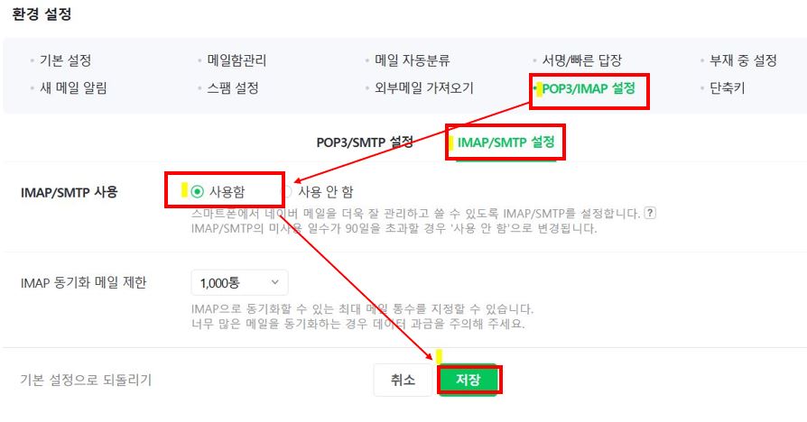 네이버 메일을 연동을 하는데 있어서 아이디와 비번이 틀리지 않았는데도 오류가 발생하는 원인은 네이버에서 외부 메일이 수집을 할 수 있도록 허용을 안 해주었기 때문입니다. 네이버 메일 환경 설정에 들어가서 아래와 같이 설정만 해주면 G메일에서 네이버 메일을 불러올 수 있게 됩니다.